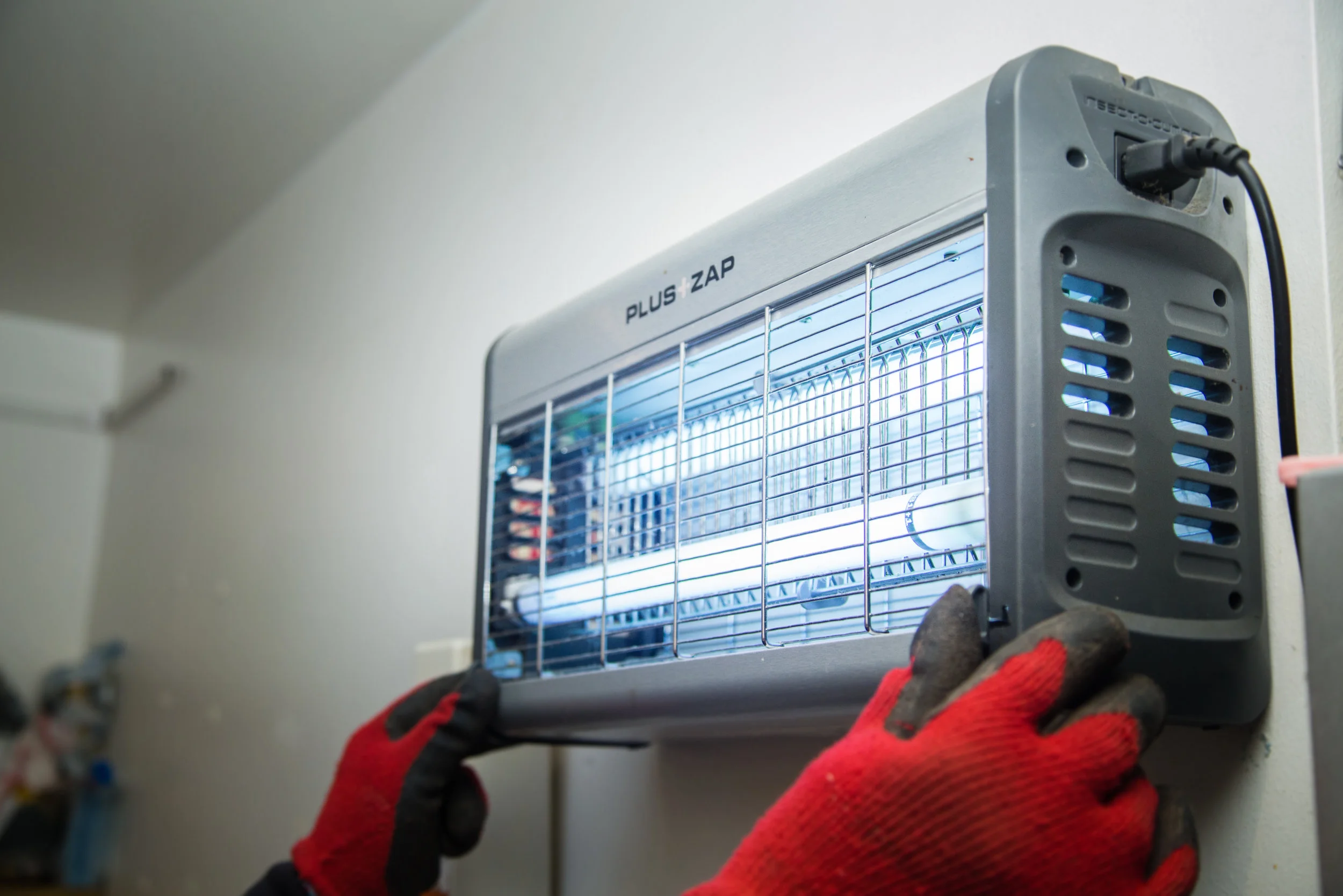 You’ll see these in most kitchens, the UV lights attract the flying insects first and then the electric grill kills them. The position of these is important, firstly don’t put them anywhere visible to outside as they may actually draw flies into your premises, secondly don’t put them above a food preparation surface as a fly may fall from the catching tray into the area below, consider airflow from air conditioning or heat services and finally the optimum height is around 2m.